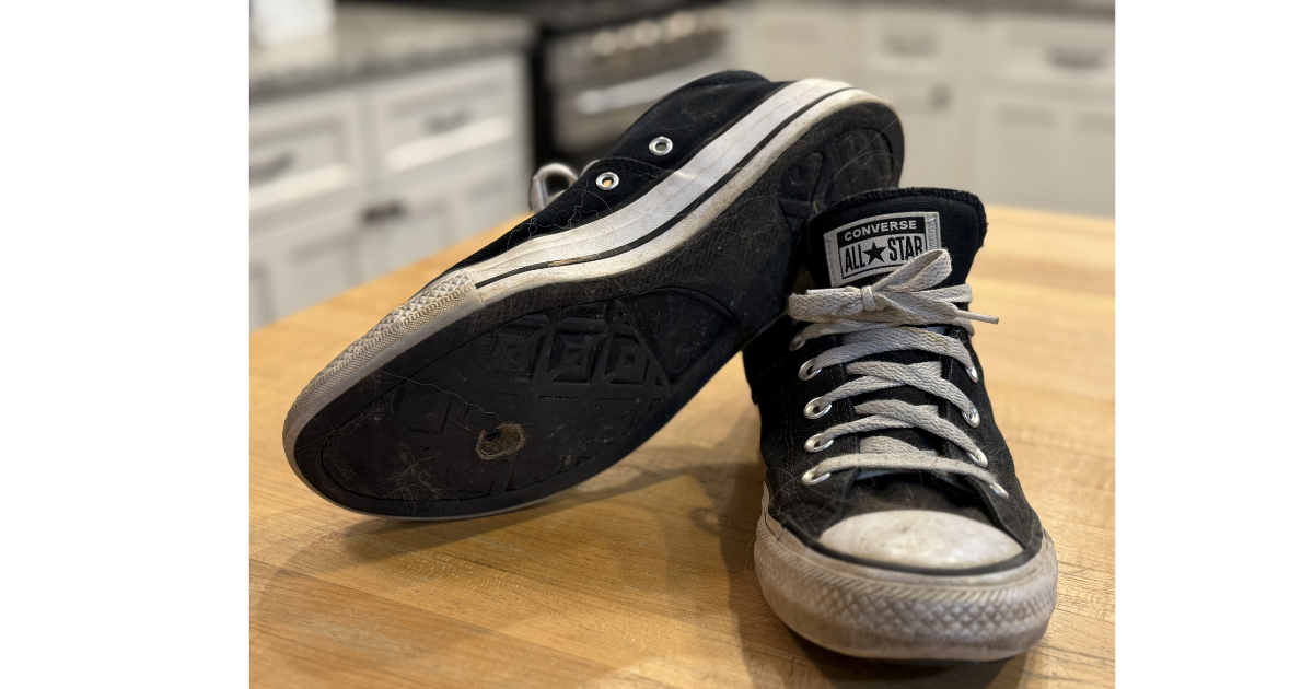 I grabbed my pair of five‑year‑old low‑top Converse when I headed out to train this past weekend. I brought them into the bathroom and set them beside the clothes I had chosen to wear.